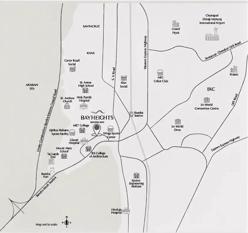 Hiranandani Bay Heights is located opposite Rang Sharada in Bandra West. Key landmarks include Lilavati Hospital (2 mins), Bandra Railway Station (3 mins), Western Express Highway (5 mins), BKC (10-15 mins), and Mumbai Airport (20-30 mins).